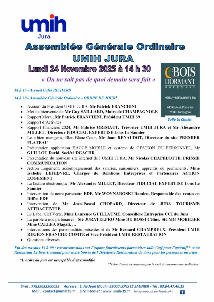 L’ASSEMBLEE GENERALE ANNUELLE DE L’UMIH 39 et LA SOIREE DE L’HOTELLERIE RESTAURATION DU JURA qui suivra